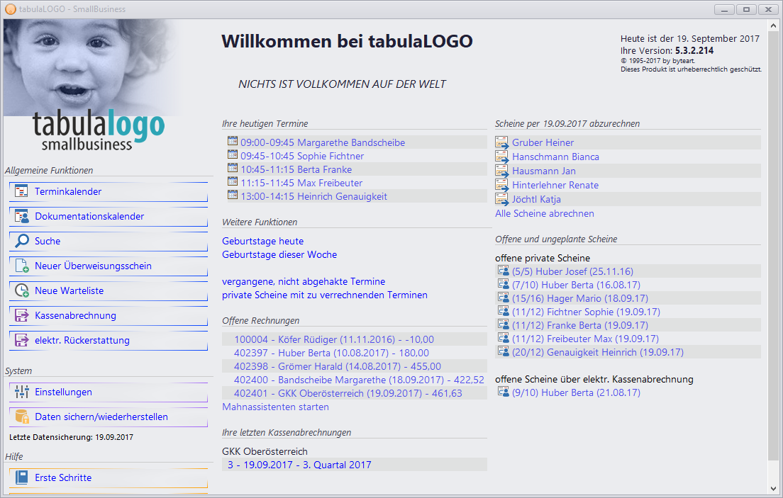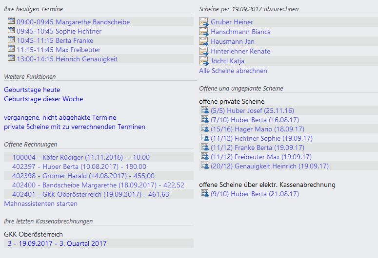 - Scheine per heute abzurechnen: eine Liste der vollständig behandelten Überweisungsscheine - starten Sie direkt hier den Abrechnungsassistenten