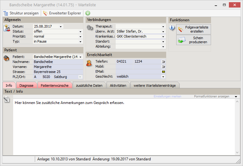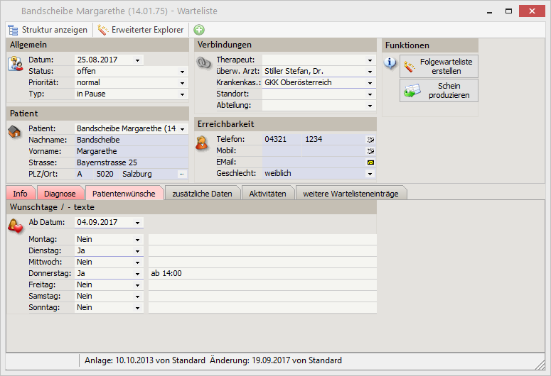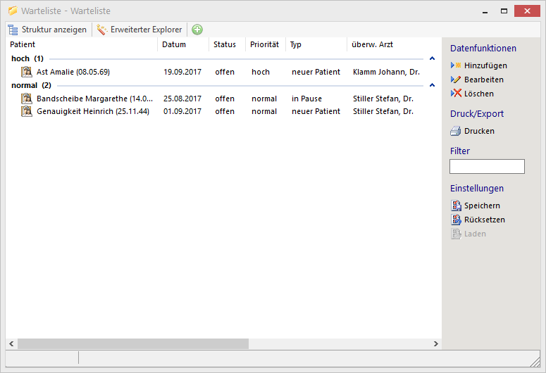 In die prophysio Warteliste können Sie neue oder bestehende Patienten mit den unterschiedlichsten Informationen aufnehmen. Im Terminkalender steht Ihnen eine schnelle Übersicht, über die Warteliste zur Verfügung. Dabei können Sie sofort aus einem Wartelisteneintrag einen Behandlungsschein erstellen und wiederum die Termine im Terminkalender planen.