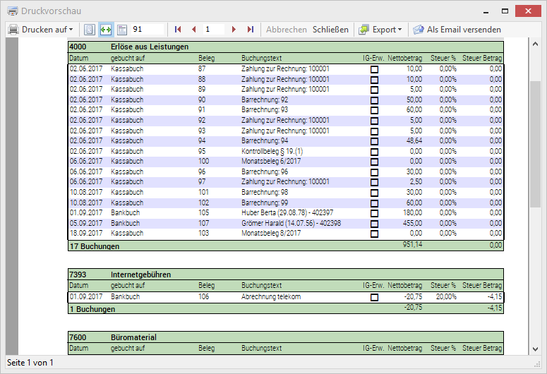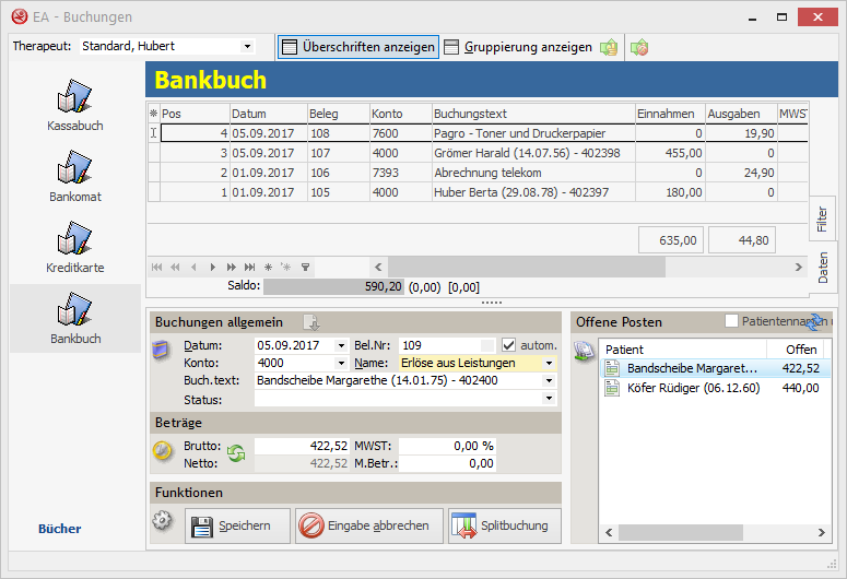 Mit der direkt integrierten Einnahmen- / Ausgabenrechnung können Sie auf eine einfache Art und Weise Ihre aufzeichnungspflichtigen Geldbewegungen strukturiert auf, von Ihnen vorgegebene Konten, verbuchen. Die mit tabulaergo erstellten Rechnungen können Sie dabei mittels Doppelklick in die Buchungsmaske übernehmen.