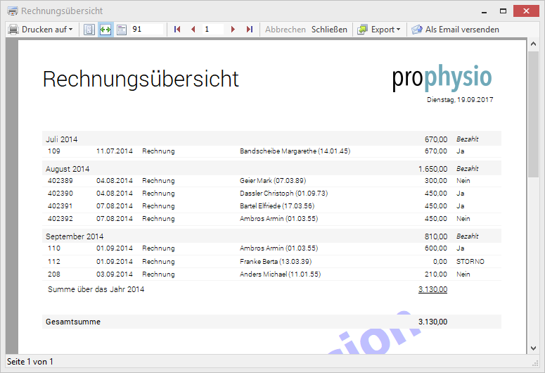 - Rechnungsübersicht: Umsatzliste über alle Rechnungen die innerhalb eines Zeitraumes gestellt wurden. Speziell für die doppelte Buchhaltung.