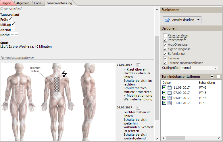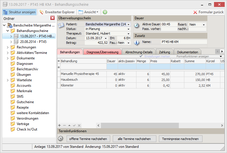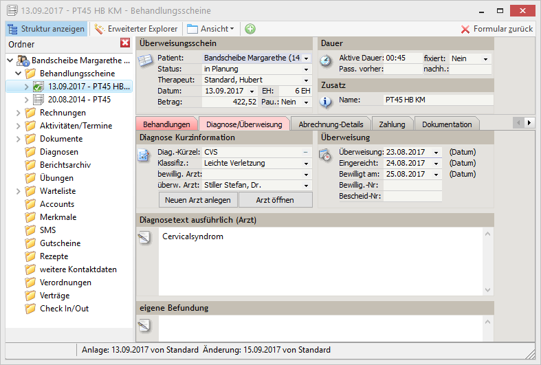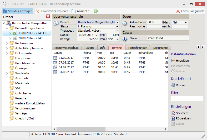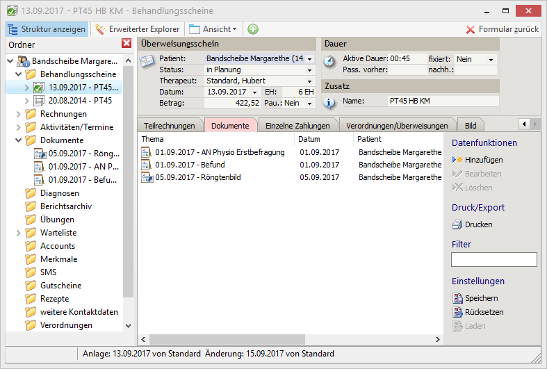 Das Behandlungsschein Verwaltungssystem beinhaltet sämtliche Informationen zu den einzelnen Behandlungsserien, beginnend mit den zu planenden Leistungen, der Diagnose, den eingetragen Terminen, die erfassten Befunde und Dokumente zur Behandlungsserie, bis hin zur Übersicht der bisherigen Dokumentation.