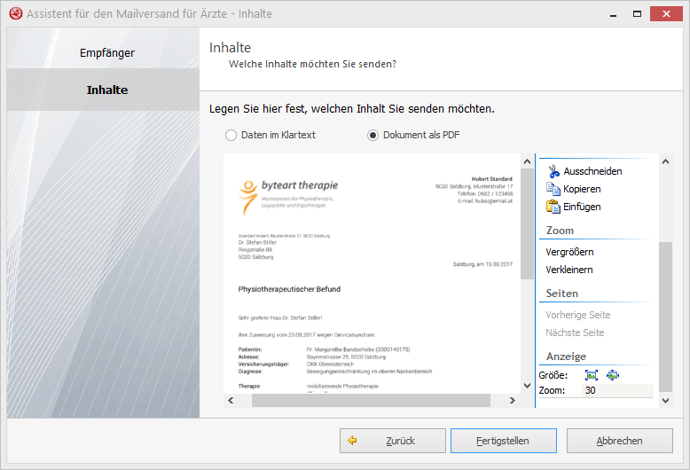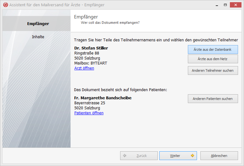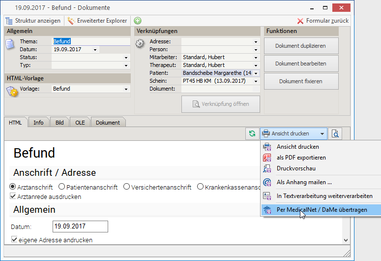 Mit der elektronischen Befundübermittlung können Dokumente und Befunde direkt aus dem tabulamed an MedicalNET oder DaMe für den Versand an den Arzt übergeben werden.