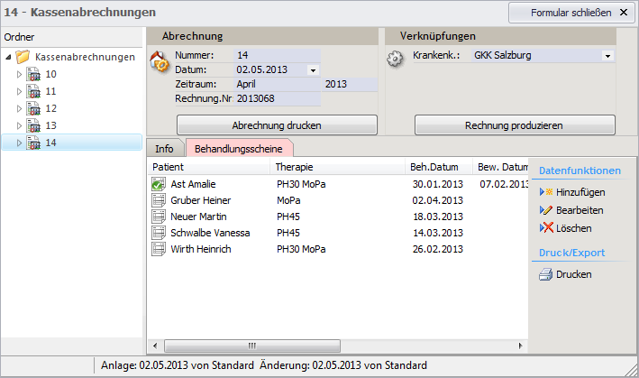 Die Registerkarte Behandlungsscheine beinhaltet alle, bei dieser Abrechnung verrechneten Behandlungsscheine. Unter Therapien sind diese Daten detailliert erläutert.