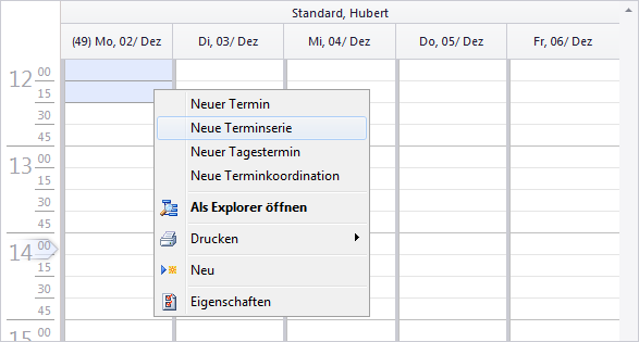 Für wiederkehrende Termine können Sie eine Terminserie anlegen. Klicken Sie mit der Maus auf den ersten Tag und die gewünschte Uhrzeit der Terminserie. Halten Sie die Maustaste gedrückt, um die Markierung in der benötigten Länge aufzuziehen. Lassen Sie die Maustaste los und klicken Sie mit der rechten Maustaste in die Markierung. Wählen Sie "Neue Terminserie" aus.